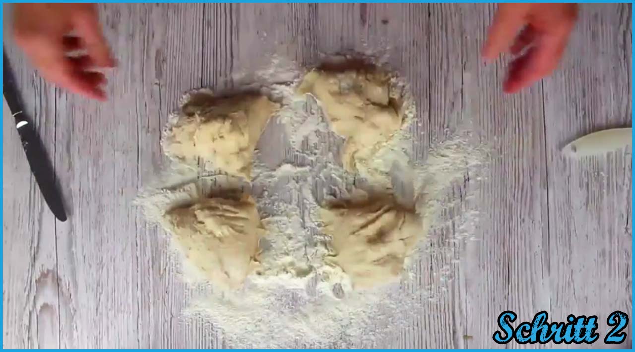 Als nächtes legst du den Teig auf eine mit Mehl bestreute Arrbeitsfläche und teilst ihn in 4 Teile.