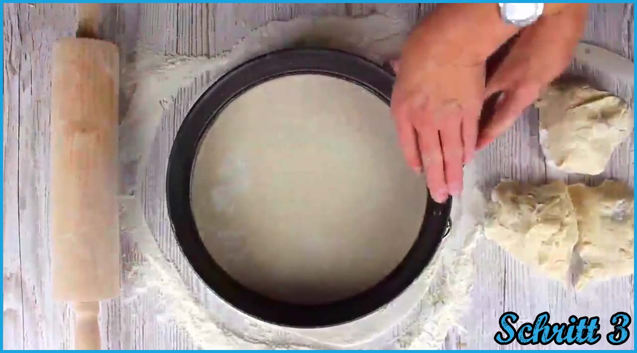 Das erste Stück Teig rollst du nun rund aus und schneidest es anschließend auf die Größe einer Springform, damit der Teig perfekt rund ist.