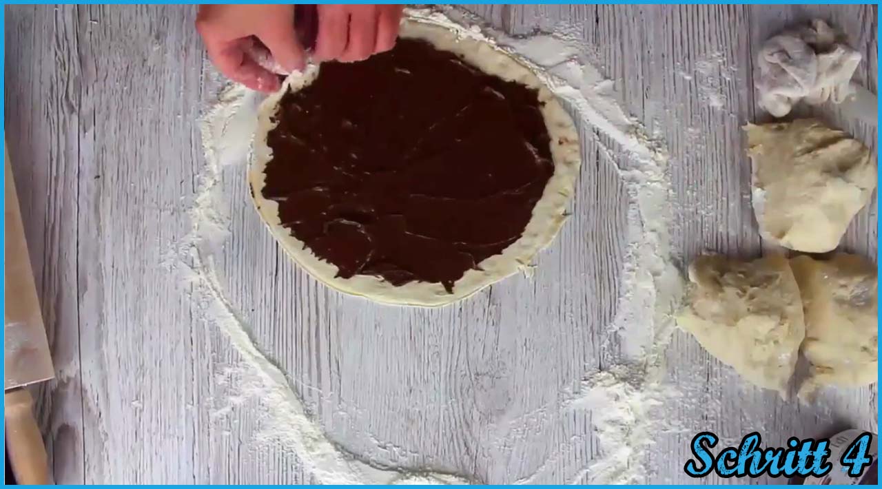 Den Teig dann dick mit Nutella bestreichen. Die nächsten beiden Teigteile genauso machen und dann übereinander stapeln. Das letzte Stück Teig nicht mit Nutella bestreichen und oben auf die anderen packen.