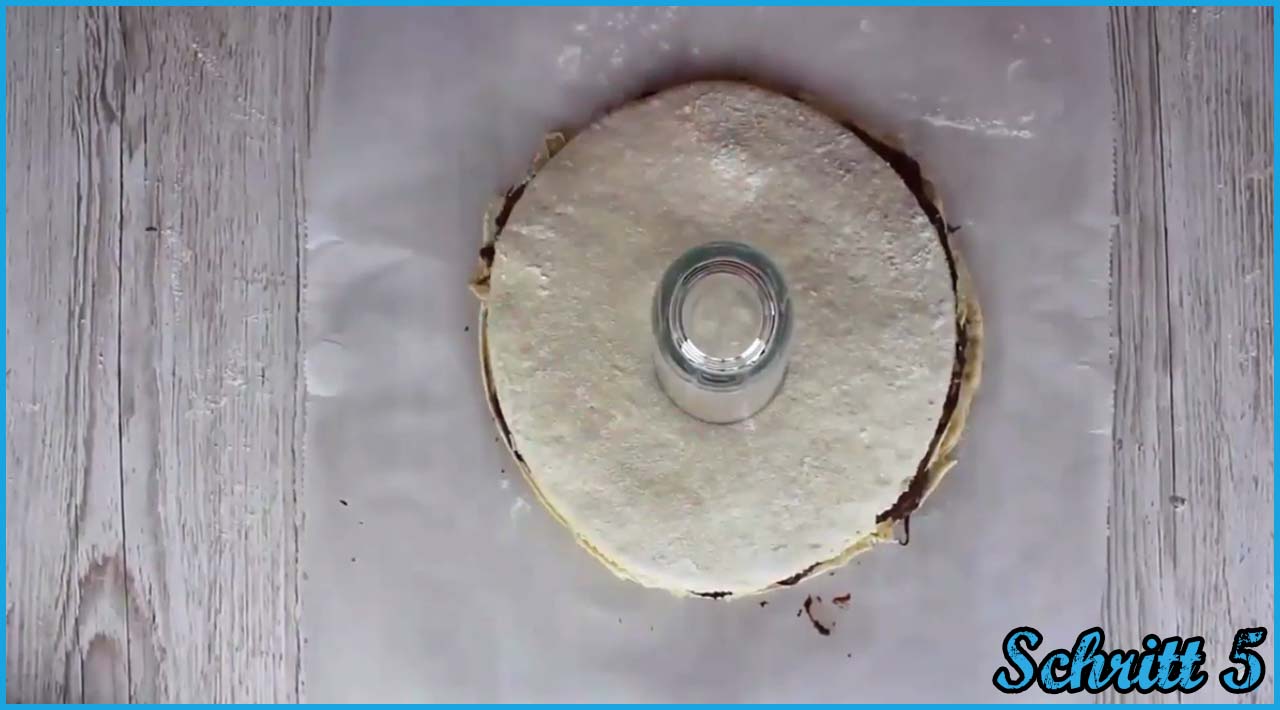 Jetzt platzierst du ein Glas in der Mitte des Teiges zur Orientierung.
