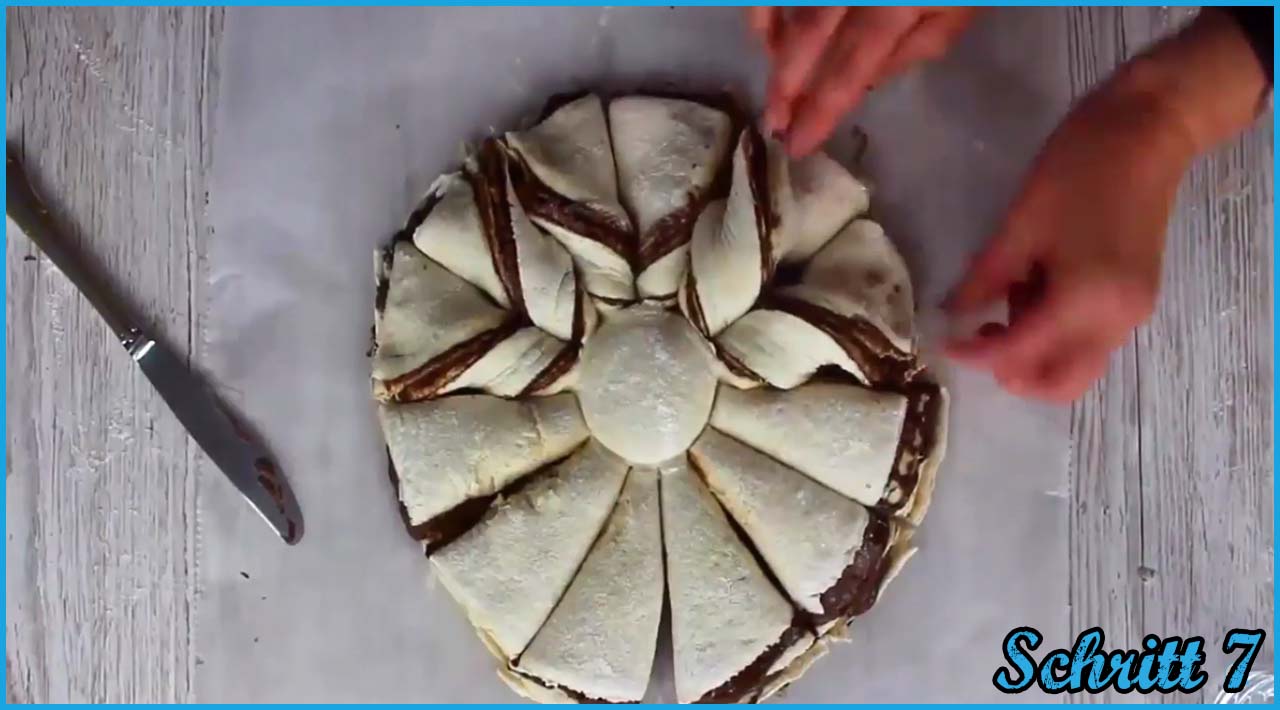 Dann nimmst du immer zwei Stücke und drehst zwei Umdrehungen nacht rechts und das andere zwei Umdrehungen nach links. Dies wiederholst du mit allen 12 Stücken. Danach kommt das Ganze bei 180 °C Umluft für 20 Minuten in den Ofen.
