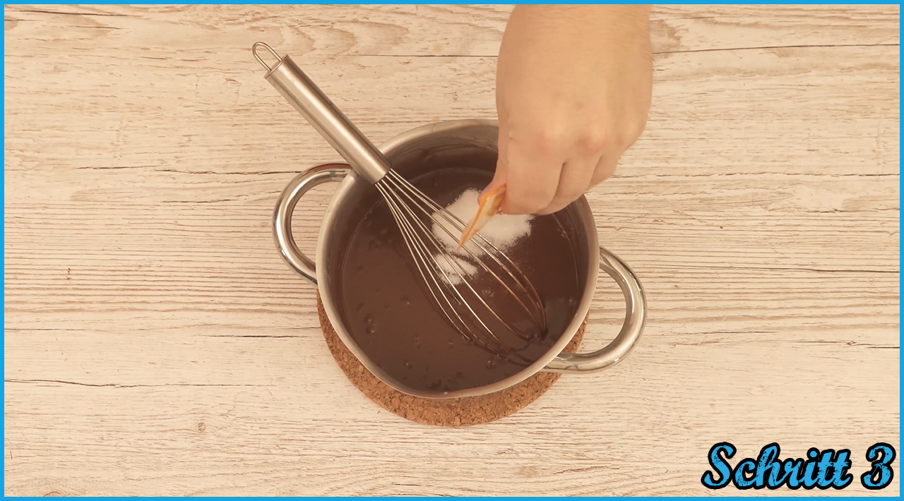 Wenn die Masse warm genug ist, um Schokolade darin schmelzen lassen zu können, füg diese hinzu und rühr die Schoki mit dem Schneebesen ein.
